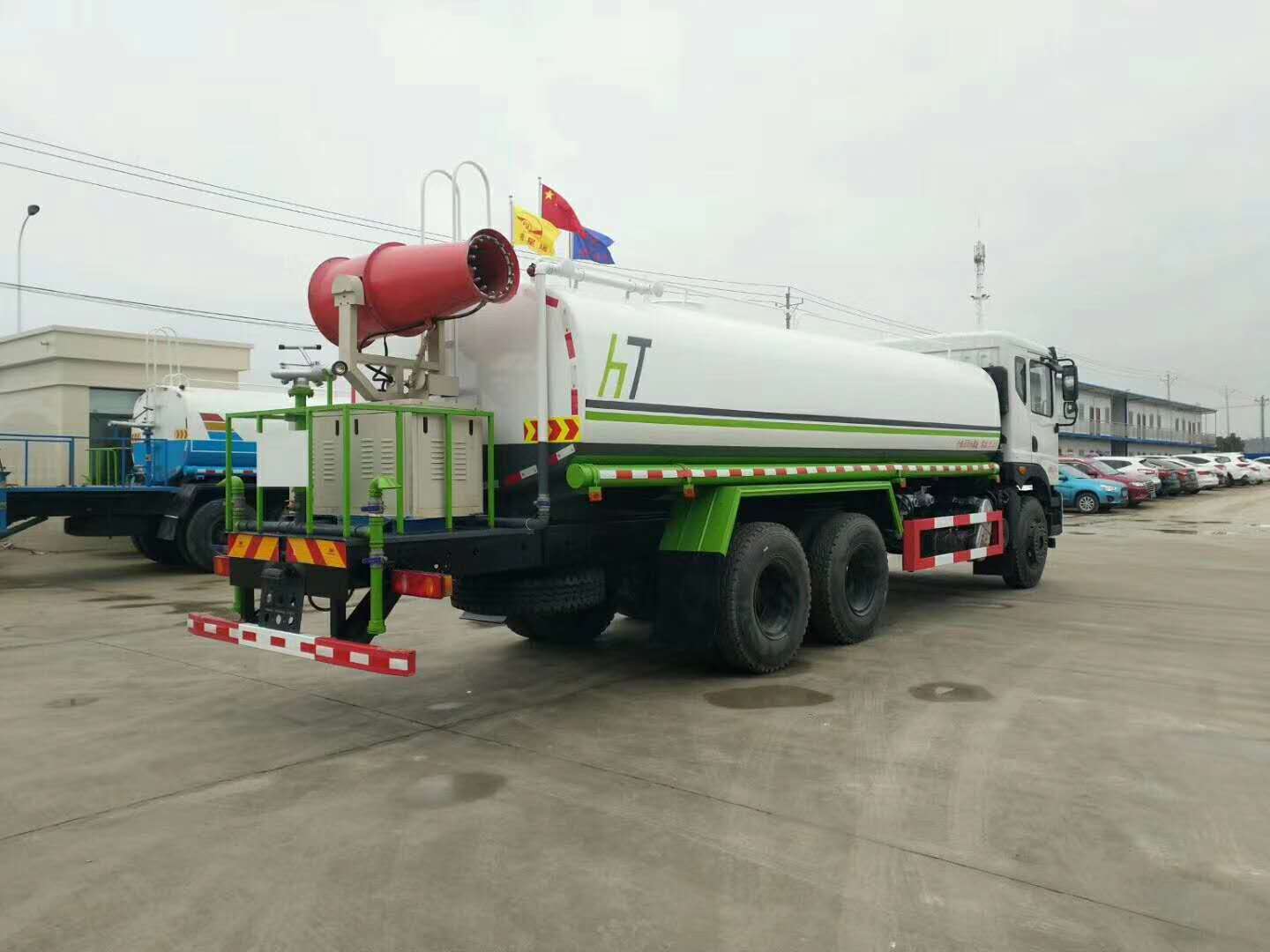 | 整车说明: | 选装驾驶室,驾驶室遮阳板为选装件.选装后高位花洒,选装方圆管道箱,选装后雾炮装置,选装后弧形喷雾.选装LED箭头指示灯,选装后平台式样,选装喷枪安装位置。仅采用4350+1350轴距底盘。罐体有效容积15.75立方米;运输介质:水,密度:1000千克/立方米;罐体外形尺寸(长度×长轴×短轴)(mm):6500×2280×1550。侧防护采用冷弯型钢/Q235,螺栓连接。后防护采用冷弯型钢/Q235,焊接连接。后防护截面高度尺寸120mm,截面宽度尺寸50mm,下边缘离地高度500mm。ABS型号/生成厂家:3631010-C2000/东科克诺尔商用车制动系统(十堰)有限公司。专用装置主要是罐体和喷洒系统,用于园林绿化,喷洒作业.选装后平台样式,外观样式及左右出水口附件位置。 | ||
